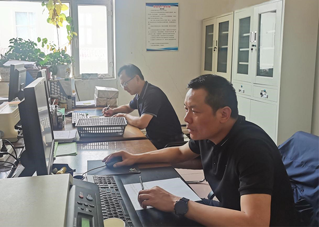 吳桂高(右)現(xiàn)場(chǎng)調(diào)閱材料